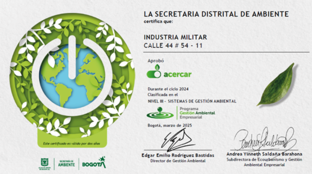 La Industria Militar recibió la certificación del programa ACERCAR de la Secretaría Distrital de Ambiente por la implementación de acciones de ahorro de agua, energía y papel que han fortalecido la cultura ambiental en la organización.